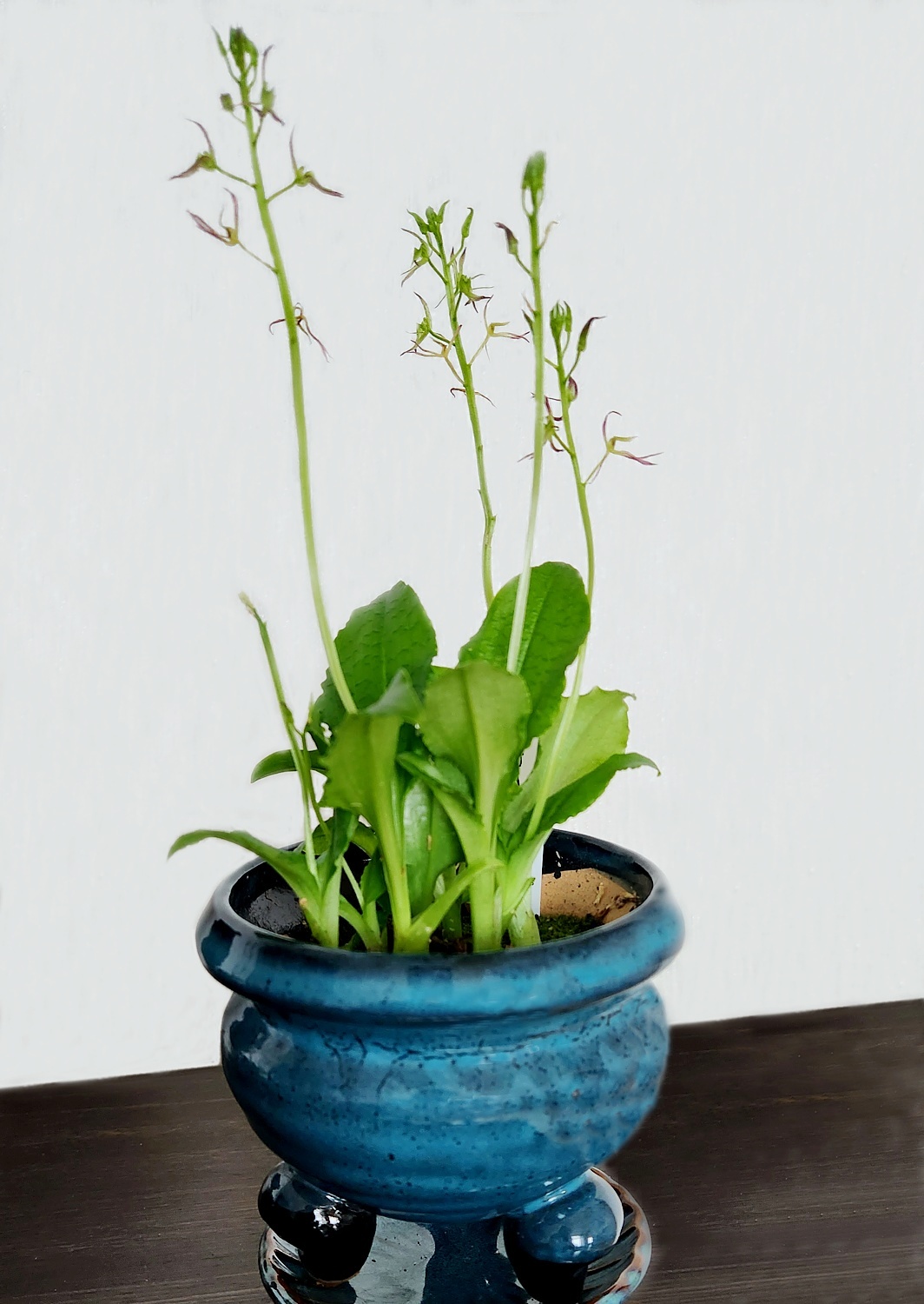 The leaves are ovate and wavy at the edges. The flowers are greenish black and bloom from June to August, and have narrow wings at the corners of the flower stalk.