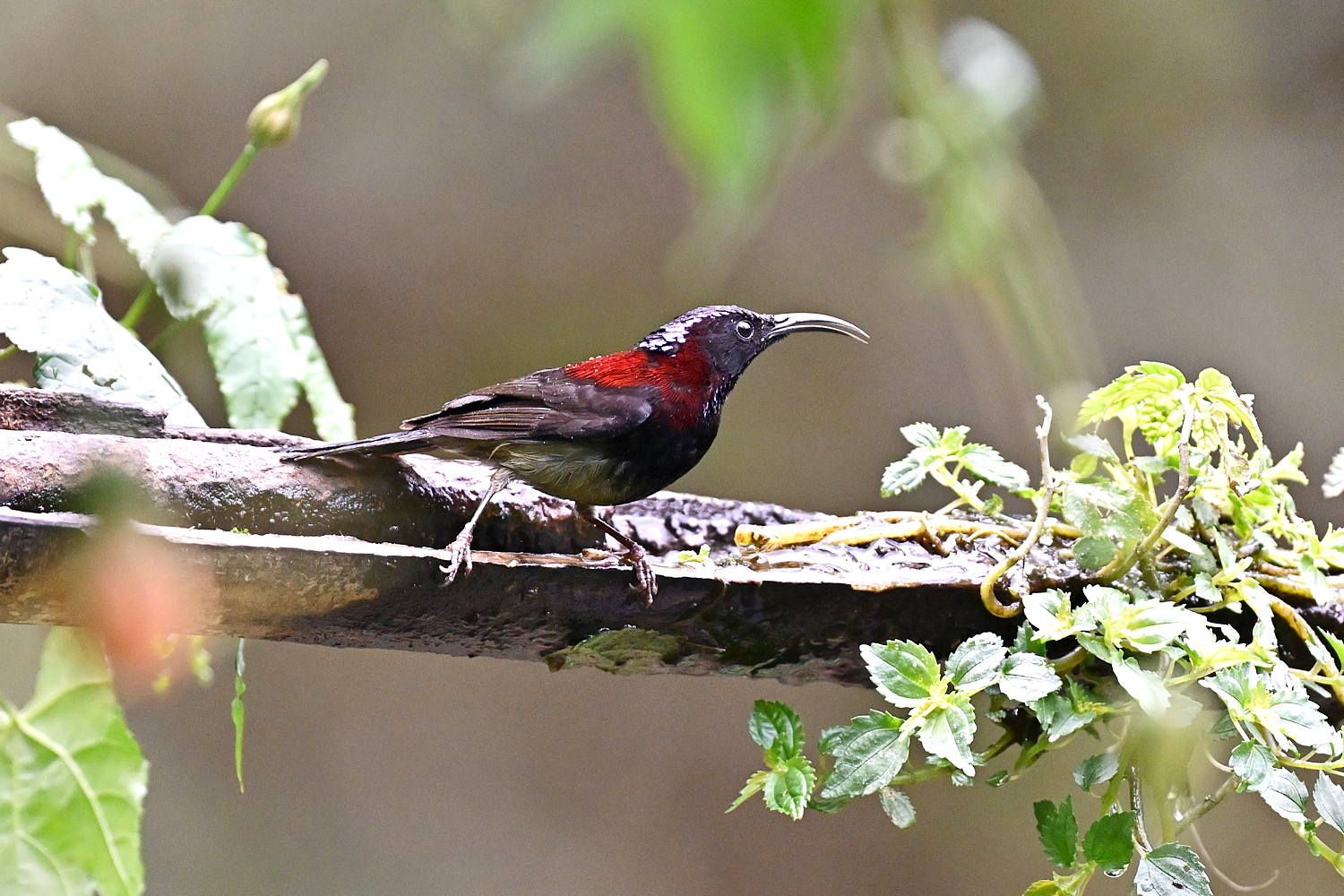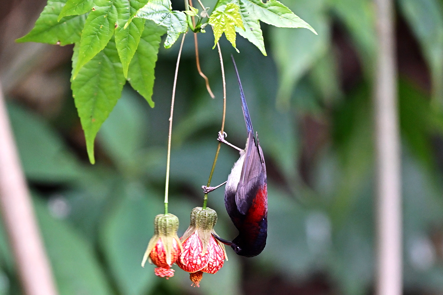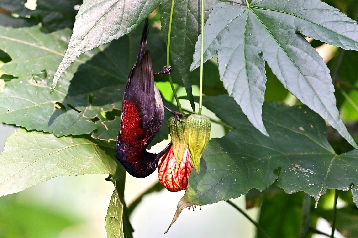 Long-tailed male is dark above with a paler belly; in good lighting, note his wine-red back and breast and a purplish-blue crown.