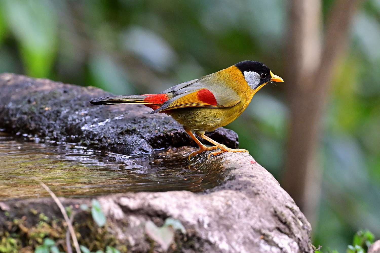 검은 머리, 밝은 은색 귀, 주황색 아랫부분, 그리고 밝은 빨간색 날개 패치를 가진 아름다운 작은 Babbler로 무리를 지어 먹이 활동을 할 때, "che-tchu che-rit" 시끄럽게 제 잘 거리며 언덕과 아열대숲을 이동하며,