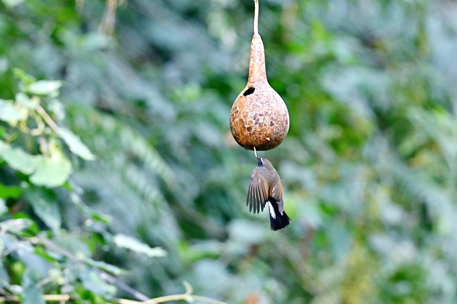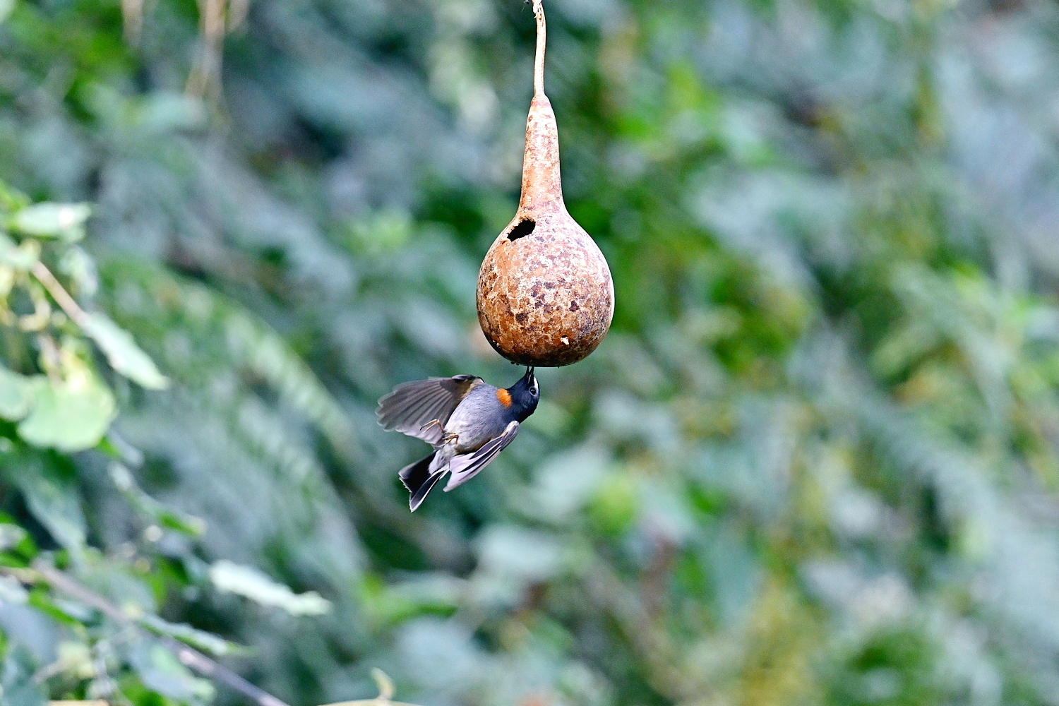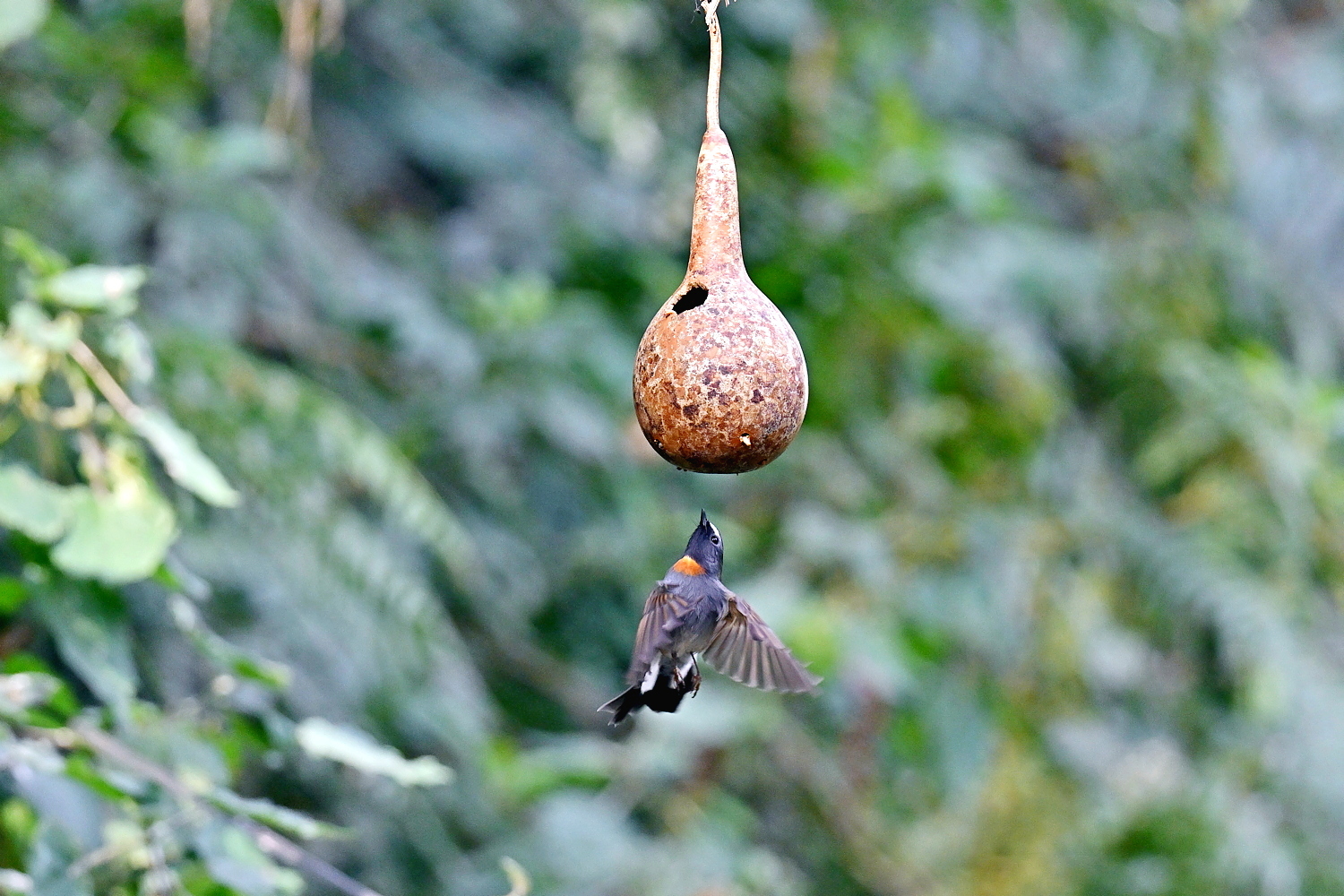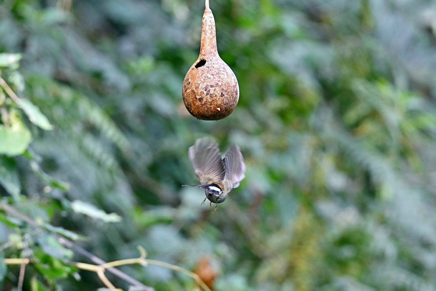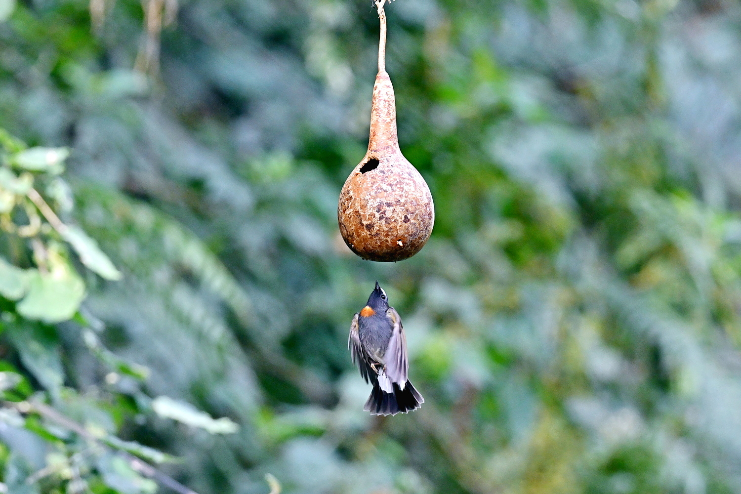 Rufous-gorgeted Flycatcher가 뒤웅박 속에 있는 Worm을 빼 먹는 장면입니다.