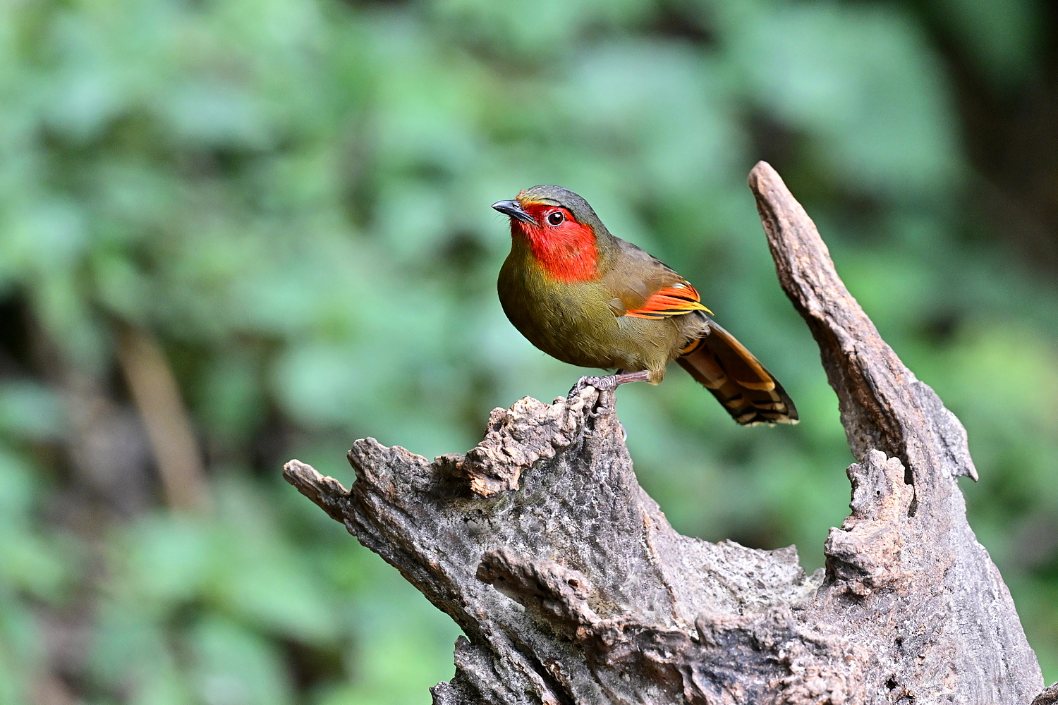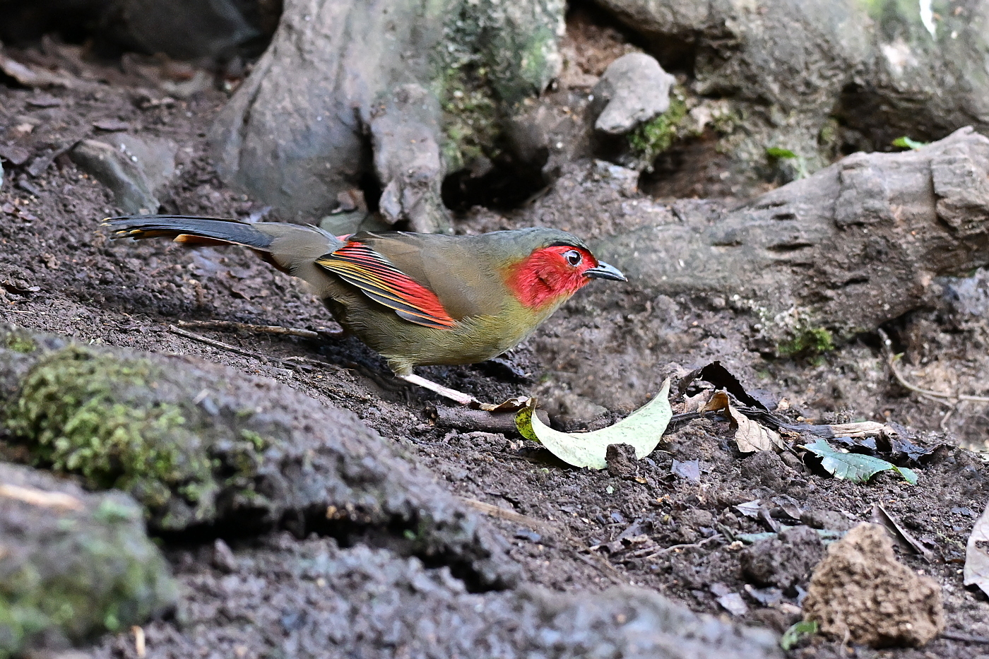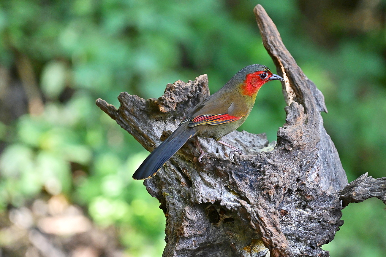 Scarlet-faced Liocichla는 중간 크기의 Laughingthrush으로 21~24cm이며, 전체적으로 올리브색이고