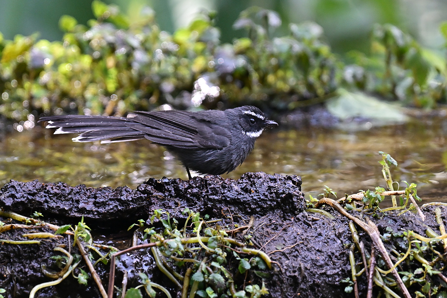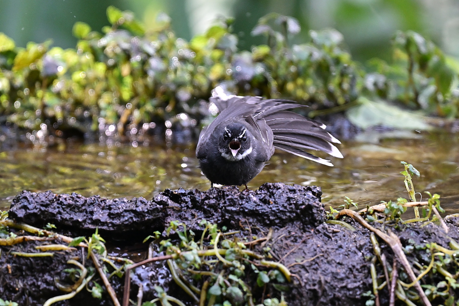 성체 Fantail 크기는 약 19cm이고, 독특한 환상동물로, 흰 목과 짧은 흰 눈썹을 제외하고는 모두 어둡습니다. 꼬리는 종종 부채꼴 모양으로, 중앙 깃털을 제외한 모든 꼬리 깃털에 흰색 끝이 있습니다.