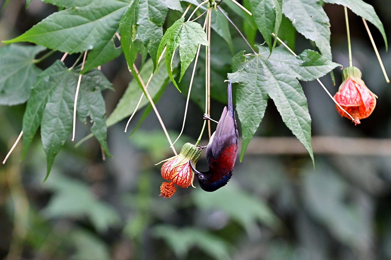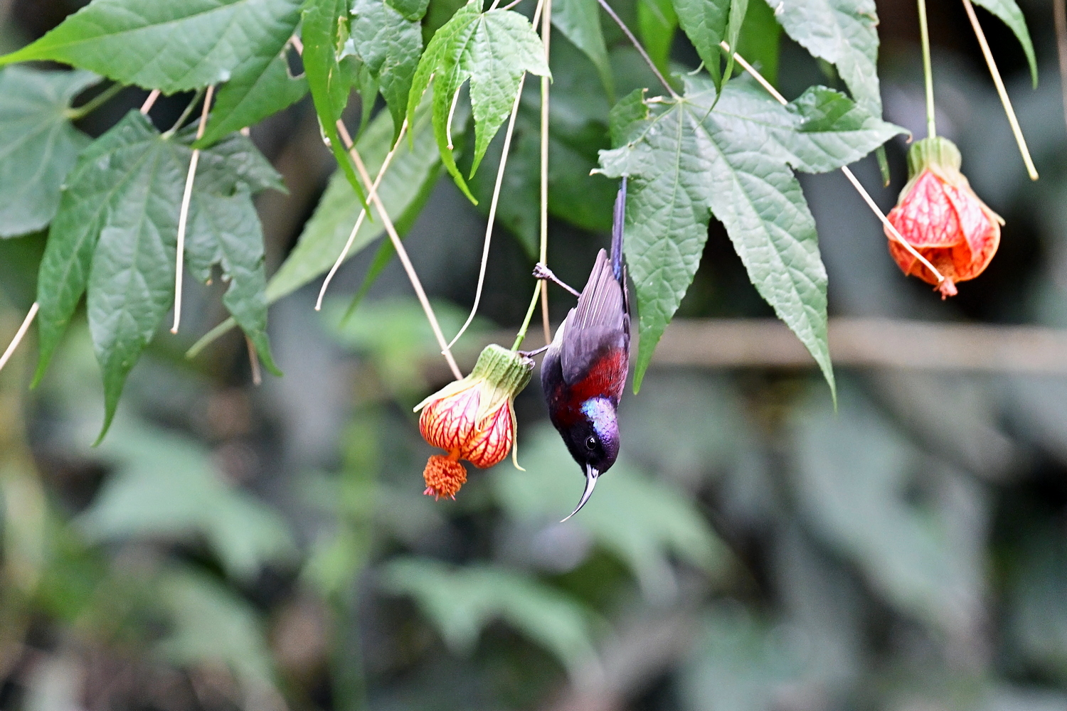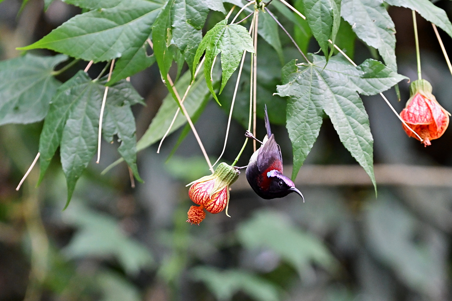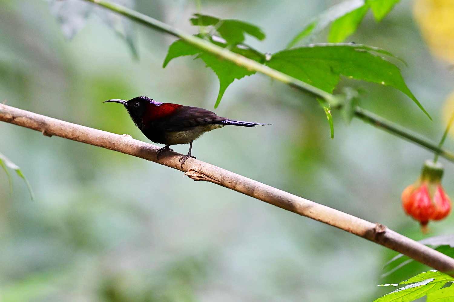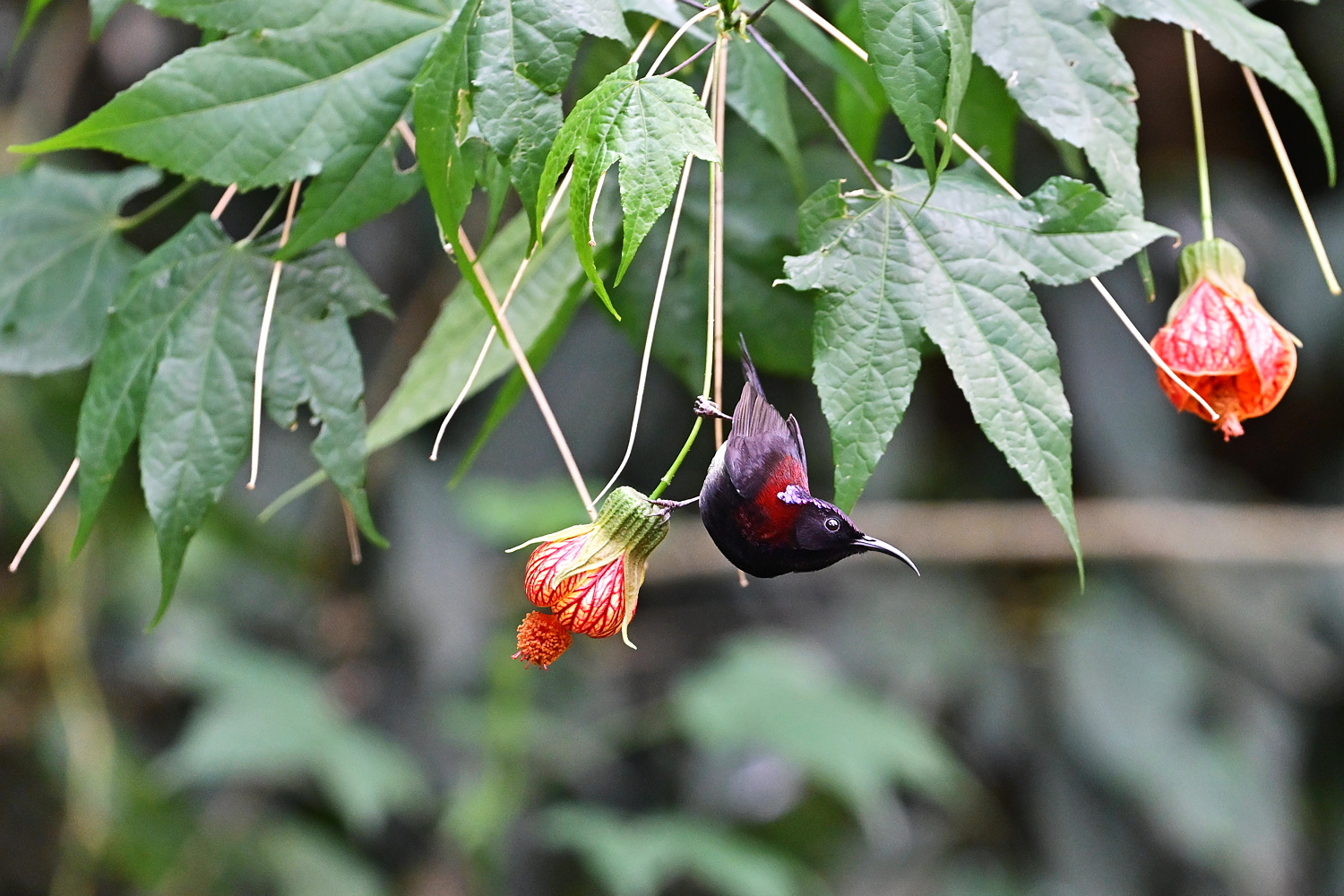 Long-tailed male is dark above with a paler belly; in good lighting, note his wine-red back and breast and a purplish-blue crown. Midnight-black throat distinguishes him from otherwise similarly-colored sunbird males.