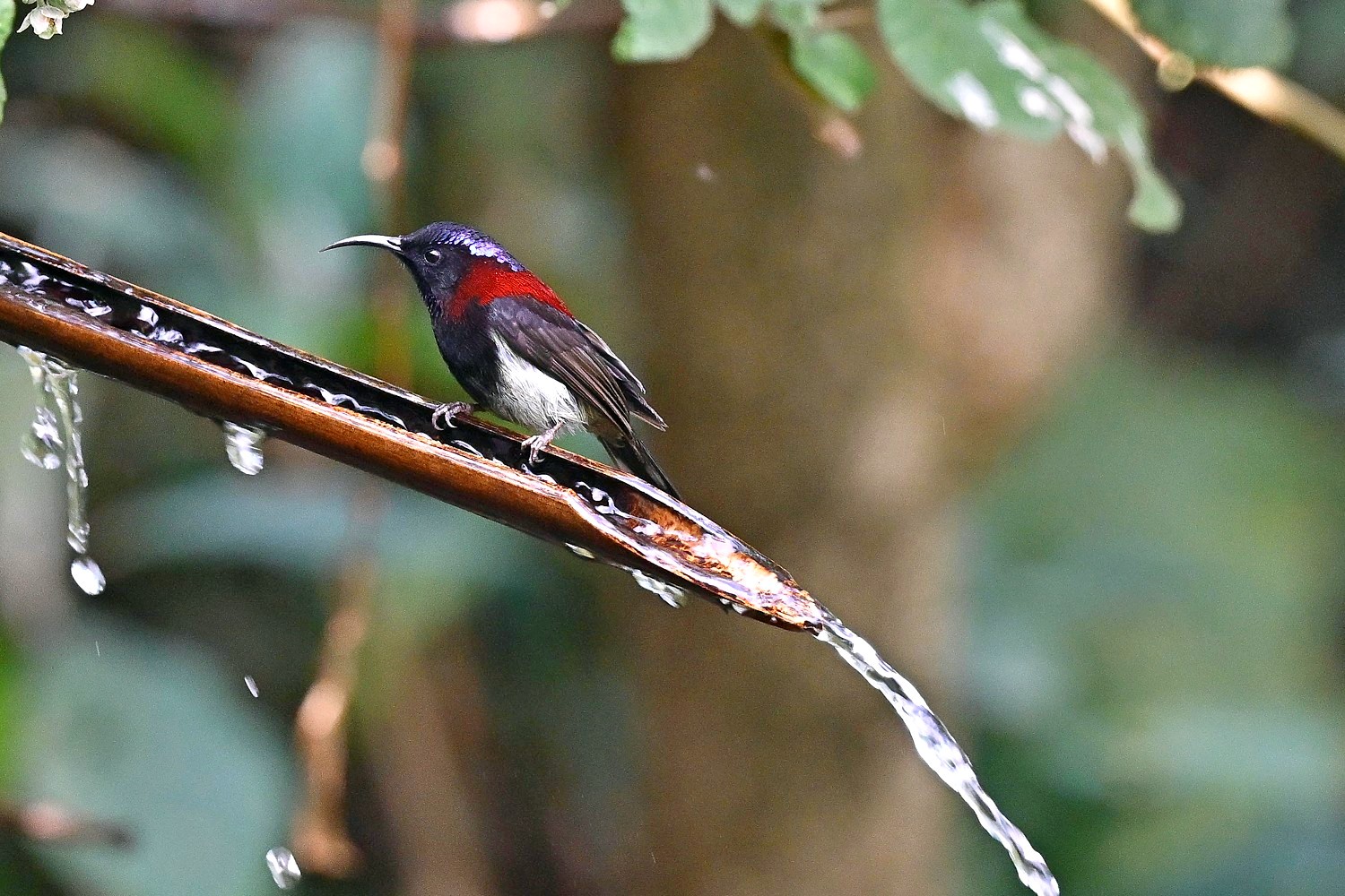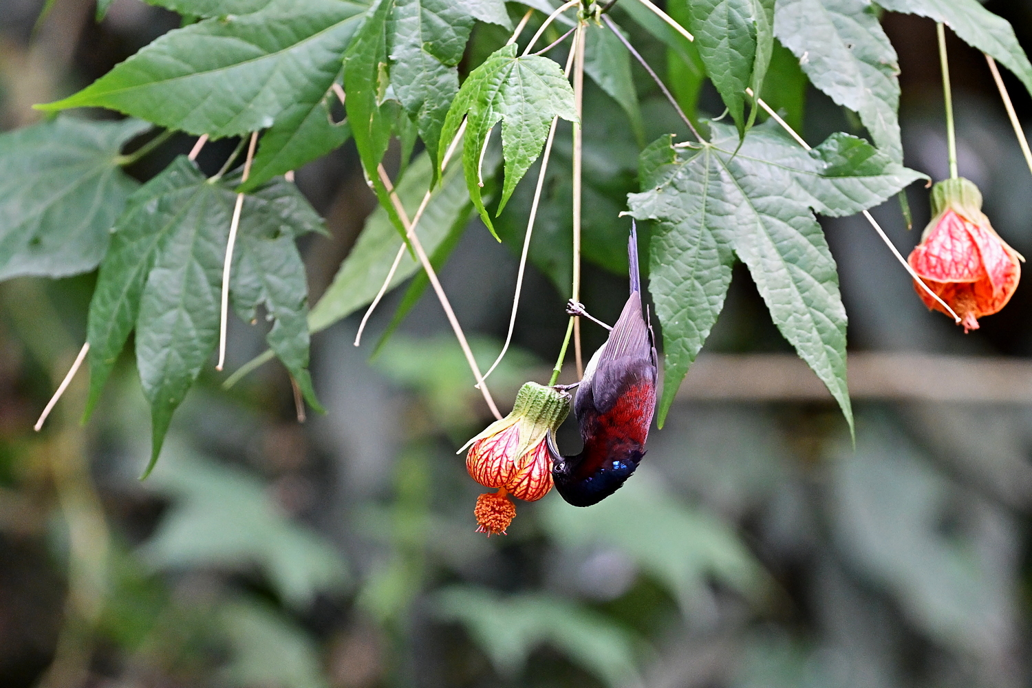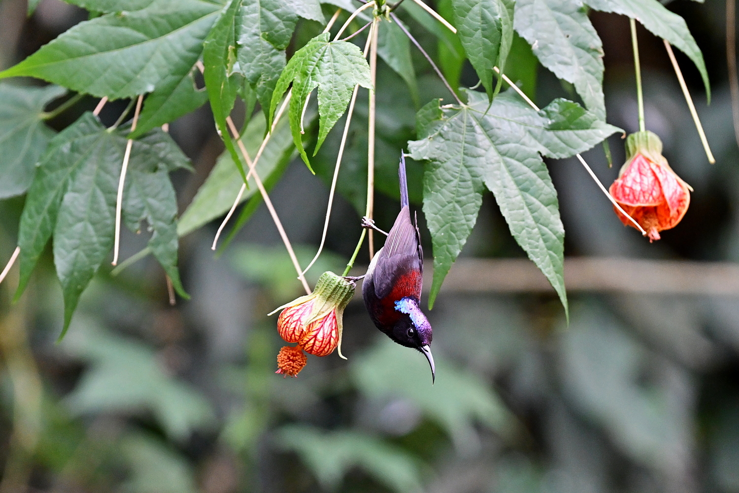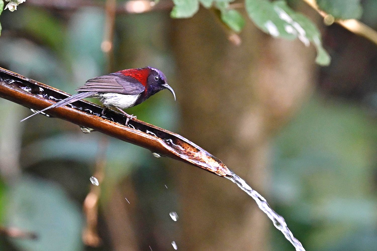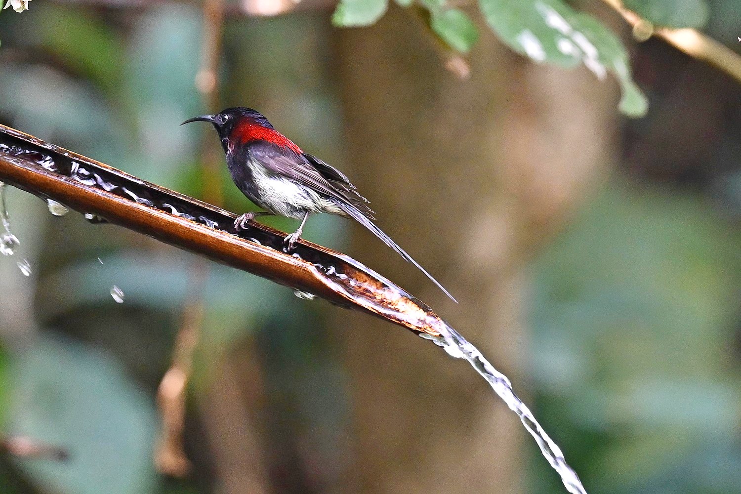 Long-tailed male is dark above with a paler belly; in good lighting, note his wine-red back and breast and a purplish-blue crown. Midnight-black throat distinguishes him from otherwise similarly-colored sunbird males.