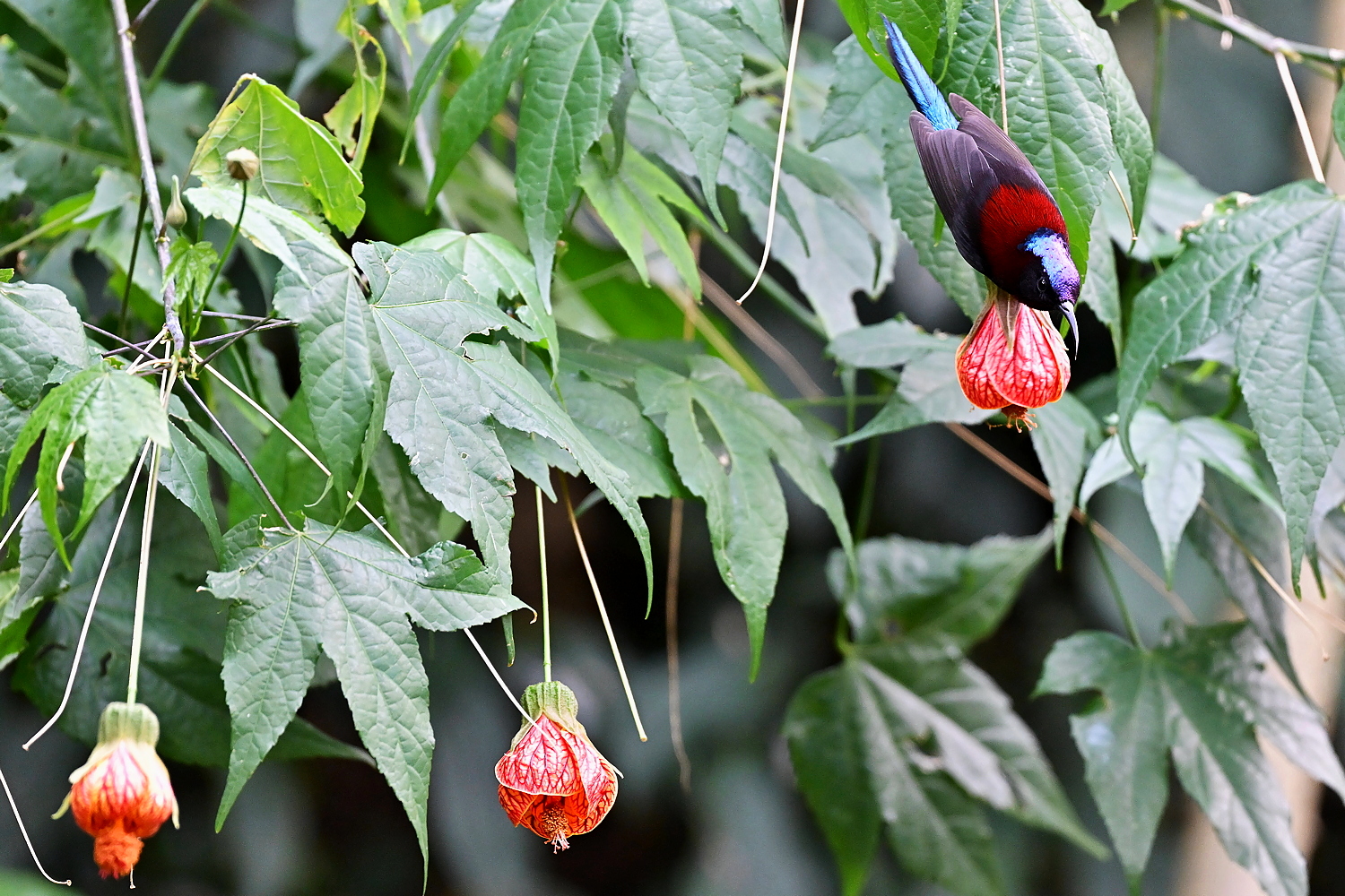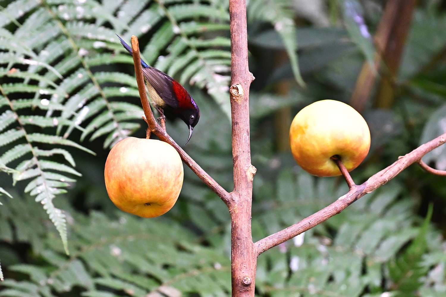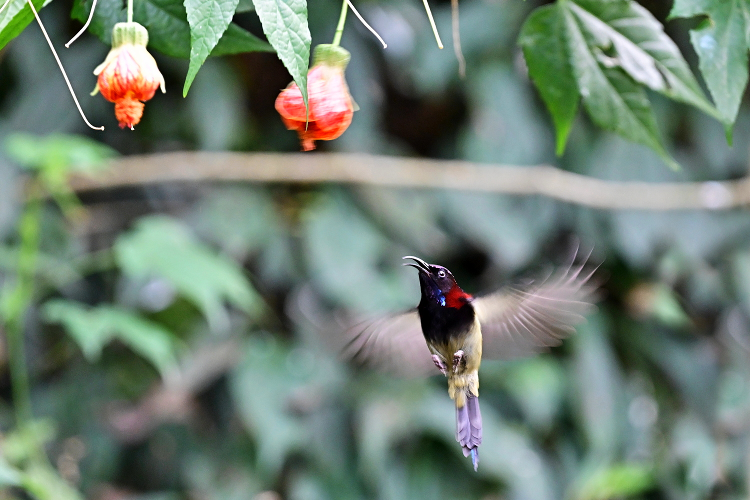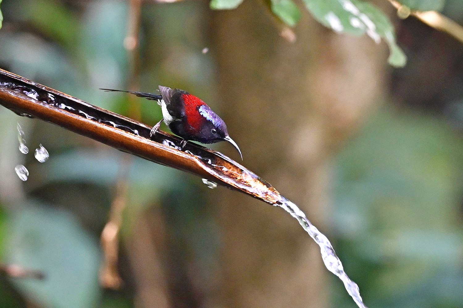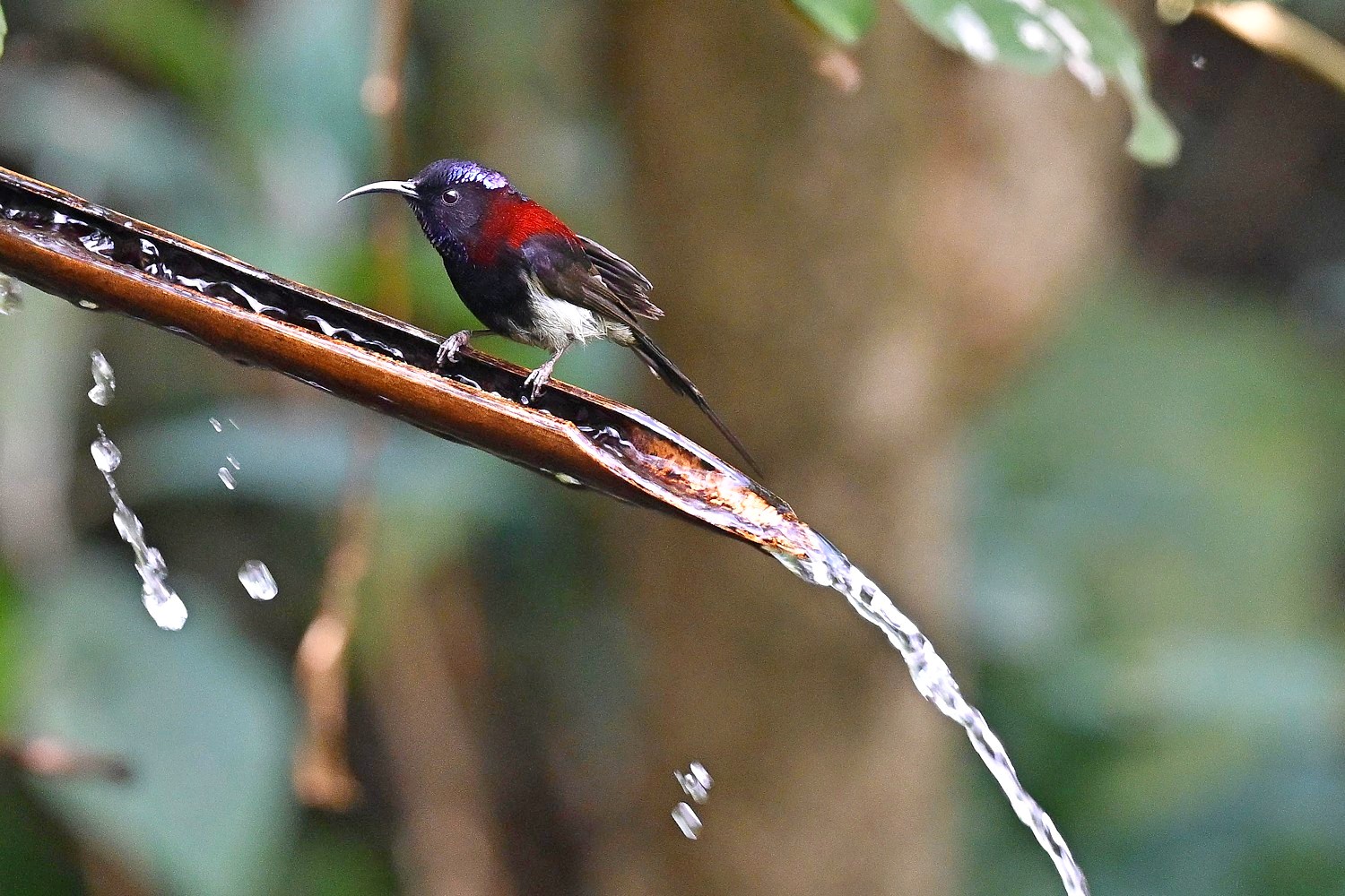 Long-tailed male is dark above with a paler belly; in good lighting, note his wine-red back and breast and a purplish-blue crown. Midnight-black throat distinguishes him from otherwise similarly-colored sunbird males.