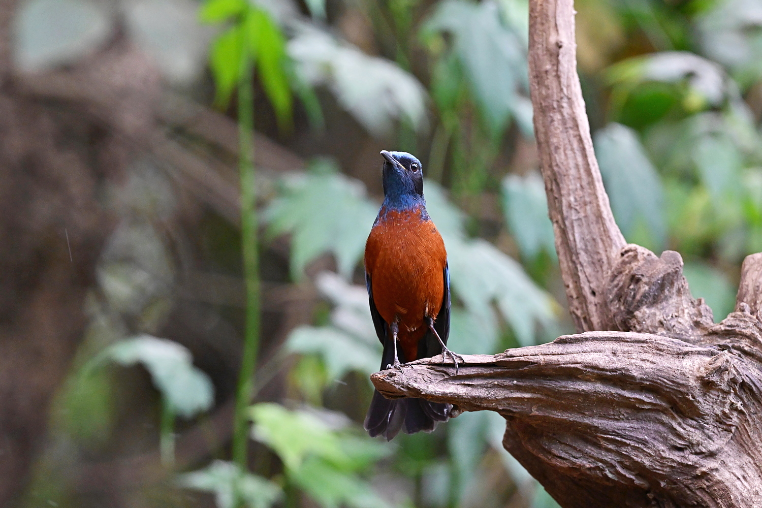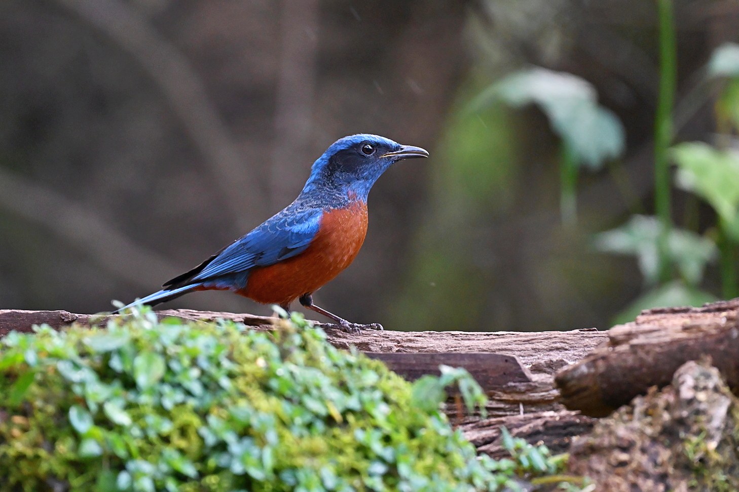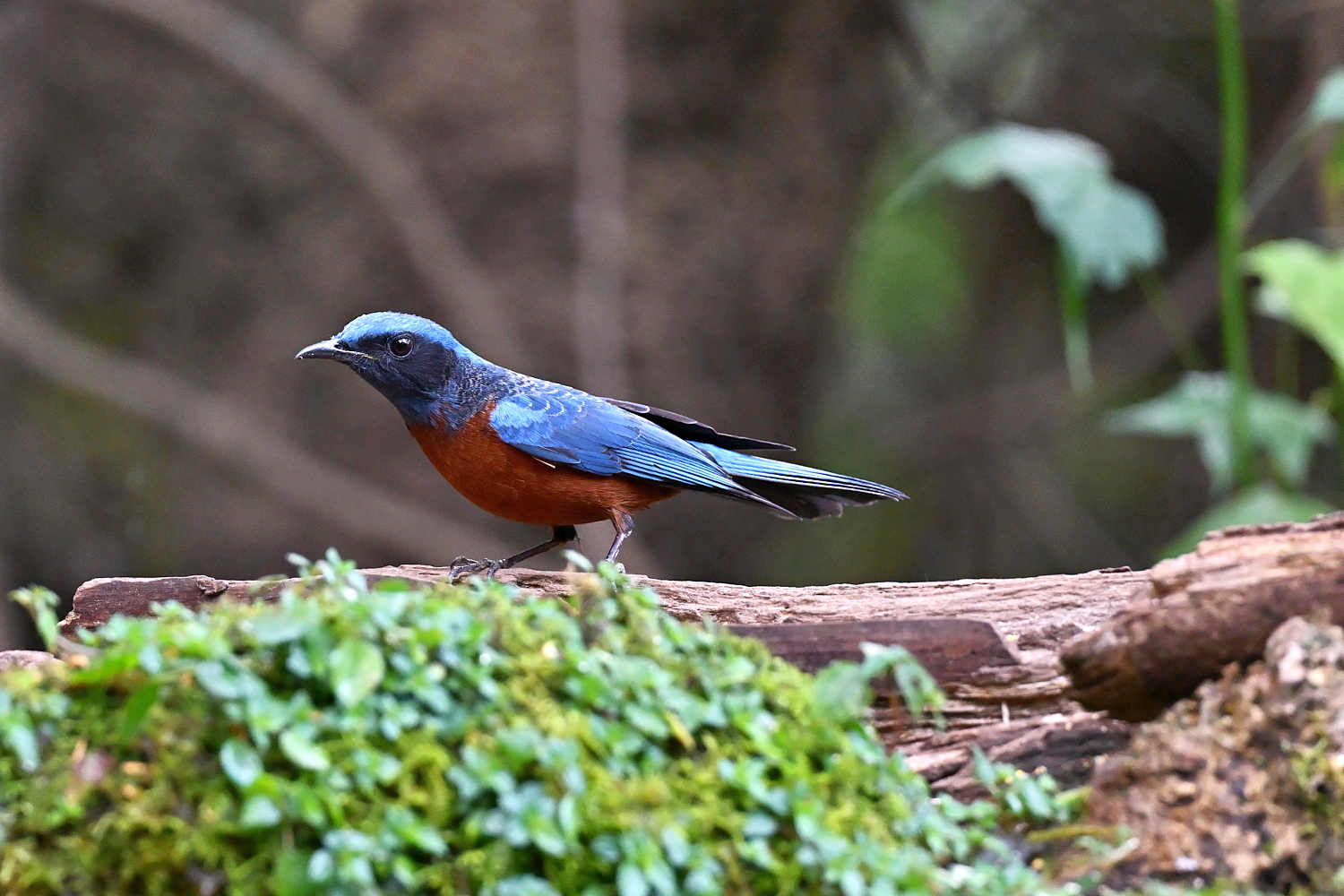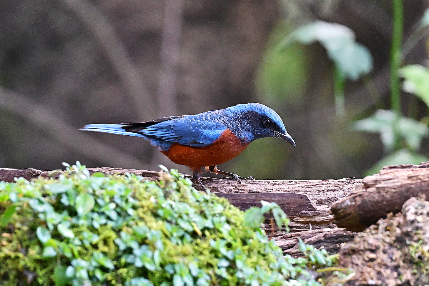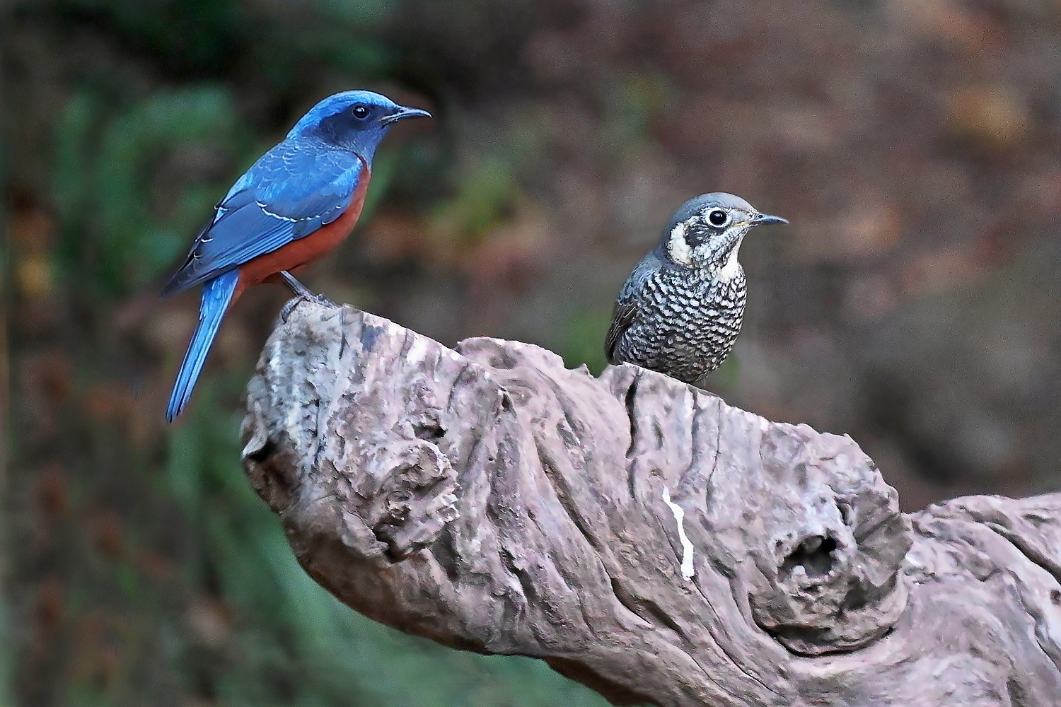 An upright bird of montane forests. Male is dark blue above and orange below, with a dark face. Female looks completely different: gray-brown with boldly scaled underparts and a whitish crescent behind the ear. Female White-throated Rock Thrush is similar, but browner, with a spotted back and no pale ear crescent.