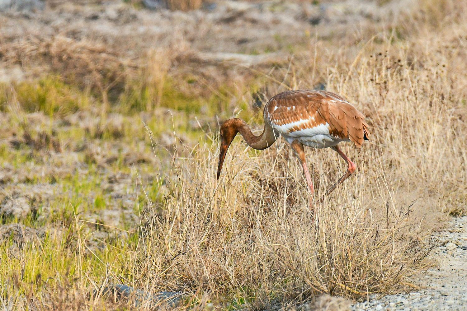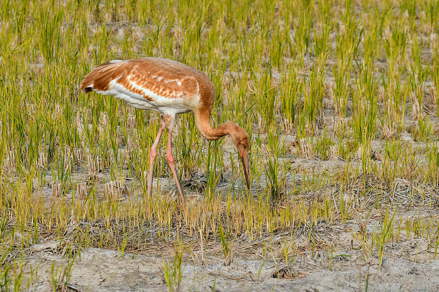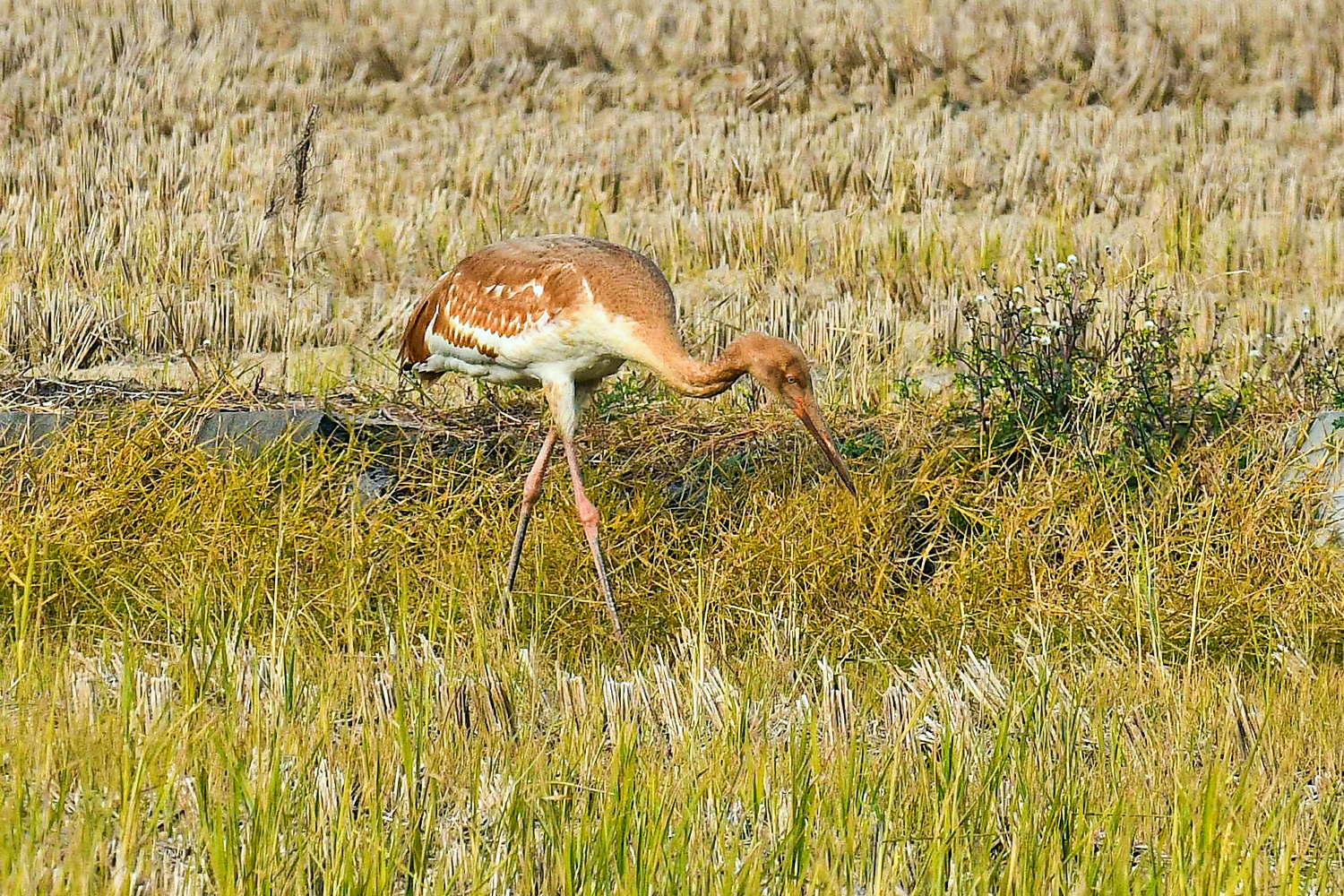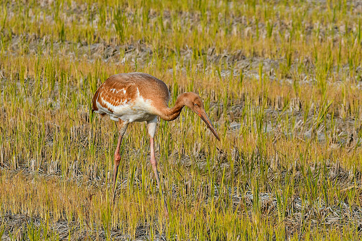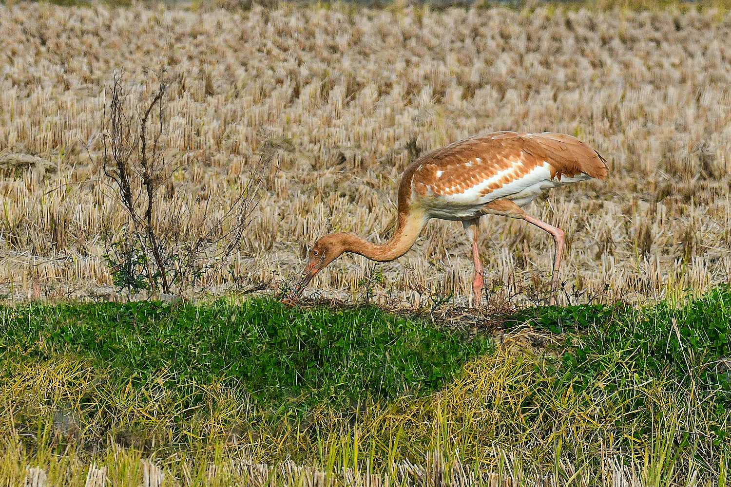 A juvenile Siberian white crane that came to Cheonsuman Bay alone last winter , goes around the rice paddies looking for prey, but has not found prey at all. This situation is very sorry.
